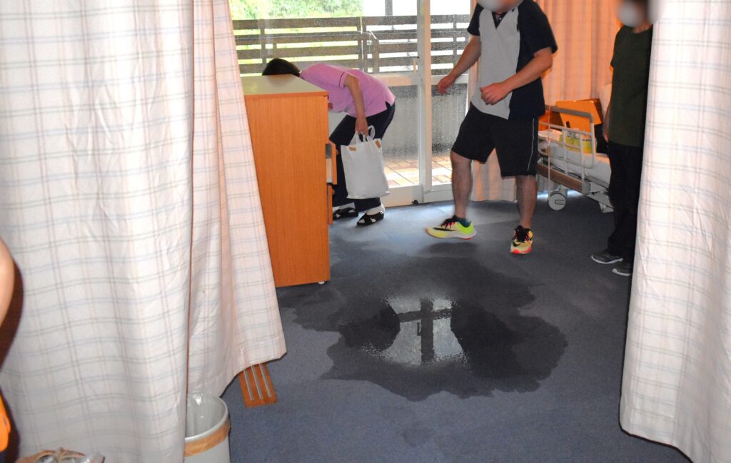 9月10日の大雨により、町内でも側溝が溢れているところもあったようで、桐寿苑でも居室の一部屋が一部浸水しました。