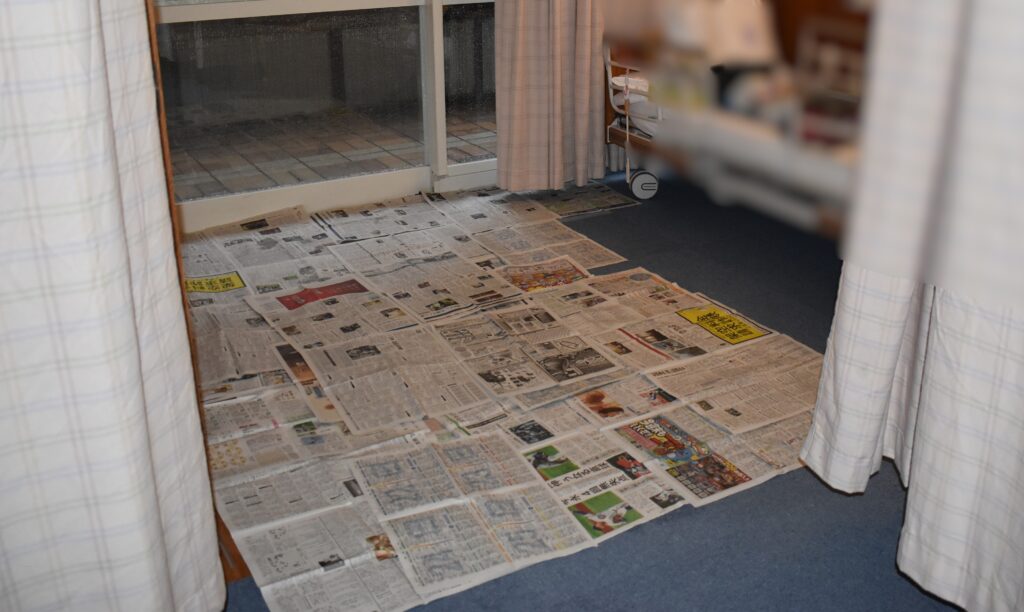 大急ぎで新聞やタオルで吸い取り、夜間が心配されましたが雨も落ち着き再度浸水等することなく翌日を迎えました。