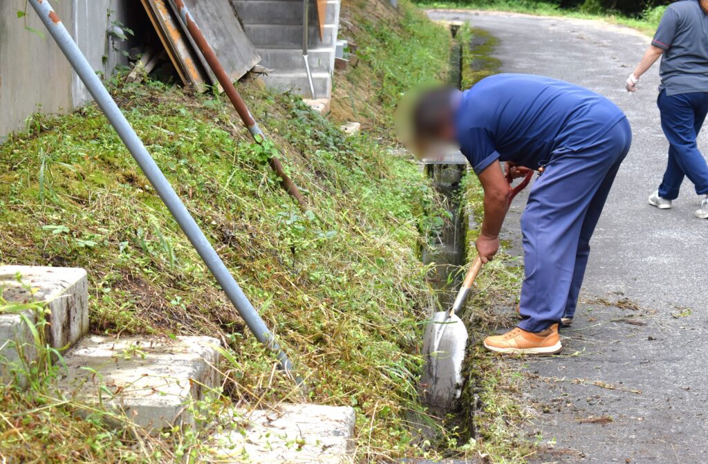 浸水した居室の外の排水溝を見てみると、枯れ葉や虫の糞などが詰まっていたため、急きょ側溝掃除を実施しました。